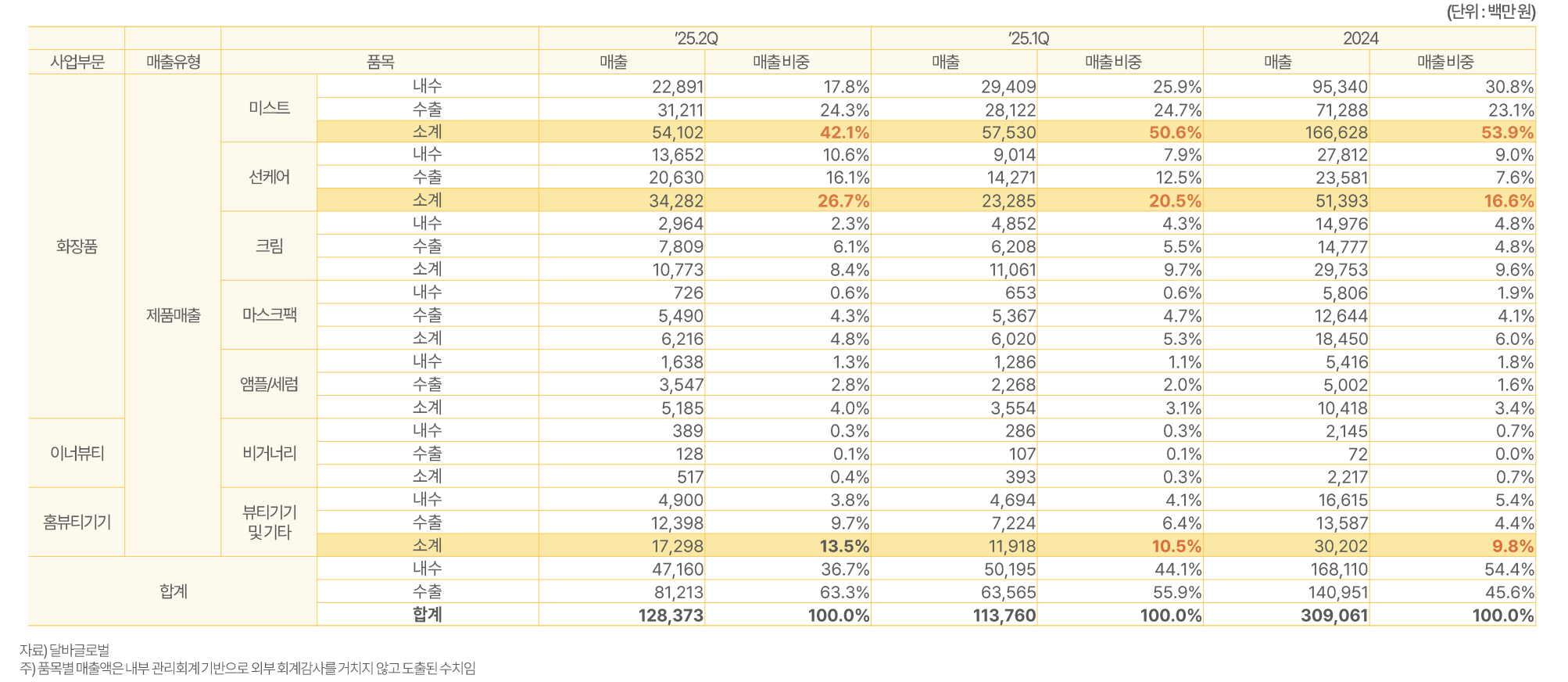 과거 매출 비중이 높았던 미스트는 42%로 줄어들었고, 선케어 제품은 27%, 뷰티 디바이스 및 기타 부문이 31%를 차지하고 있습니다. 1분기 대비 미스트 의존도가 줄어든 대신, 에센스·크림·마스크팩 등 다양한 제품군이 성장하고 있습니다. 이는 특정 제품에 의존하지 않는 안정적인 매출 구조로 전환되는 과정이며, 글로벌 시장 변화에도 유연하게 대응할 수 있는 기반이 됩니다.