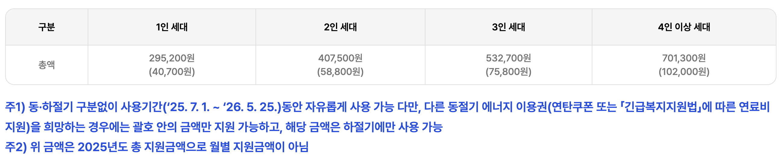 - 에너지바우처는 다른 에너지 지원(연탄쿠폰, 긴급복지 지원 등)과 중복 불가